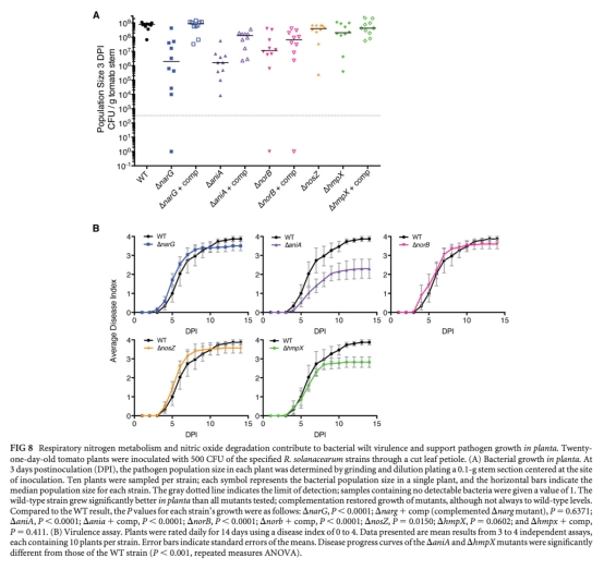 6. 植物內生長和毒力:數據來自圖8,測量突變體在番茄莖內的種群大小和疾病進展。研究意義:ΔaniA和ΔhmpX突變體在植物內生長減少且毒力降低,表明亞硝酸鹽還原和一氧化氮解毒對致病性關鍵;其他突變體生長受損但毒力未變,提示代謝冗余。這證實無機氮代謝在感染中的多角色。