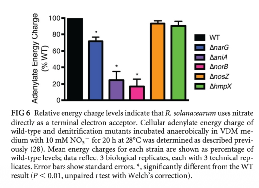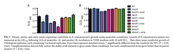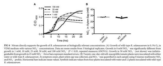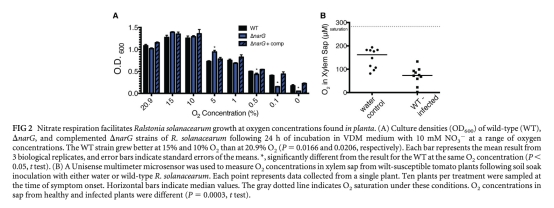 1. 青枯菌利用宿主硝酸鹽作為末端電子受體進行呼吸,在低氧木質部環境中產生ATP,支持生長。