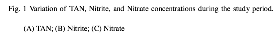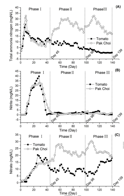 1 氮化合物濃度數據:來自圖1,顯示氨氮、亞硝酸鹽和硝酸鹽隨時間的變化。研究意義:揭示番茄基系統氨氮和硝酸鹽濃度較低,表明其氮轉化效率更高,有助于優化水質管理,減少氮損失。