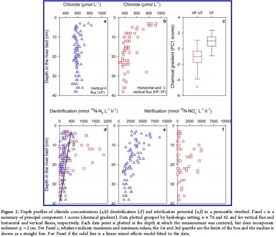 氮轉化過程速率數據:即反硝化、硝化和DNRA的速率,單位為 nmol 15N L-1 h-1。其研究意義在于這是研究的核心發(fā)現,直接、定量地證明了在河床厘米尺度上,硝化作用和反硝化作用不僅同時存在,而且速率潛力都非常高,并且有93%的測點同時檢測到這兩種過程。這些數據直觀地展示在圖2d, e, f(Figure 2d, e, f)中。圖2d顯示了反硝化速率隨深度的變化,圖2e和2f分別展示了VF和HF-VF條件下硝化潛力隨深度的變化。