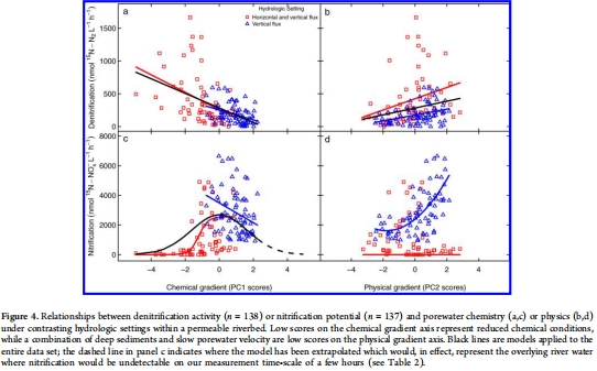 沉積物物理化學梯度數據:通過主成分分析(PCA)將多個原始變量(NO3-, NH4+, ΔO2, 深度,孔隙水流速)綜合為“化學梯度”和“物理梯度”兩個綜合指標。其研究意義在于將復雜的多變量環(huán)境因素簡化為可量化、可解釋的梯度,從而清晰地揭示了反硝化和硝化過程與環(huán)境條件之間的非線性關系。例如,分析表明反硝化在“化學梯度”上范圍很寬,而硝化則存在一個明顯的化學“斷點”。這些梯度得分與過程速率的關系展示在圖4(Figure 4)中,其中圖4a和4b展示了反硝化與化學、物理梯度的關系,圖4c和4d展示了硝化與這兩個梯度的關系。