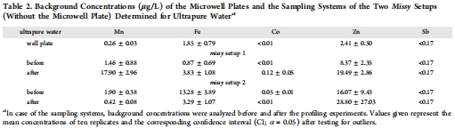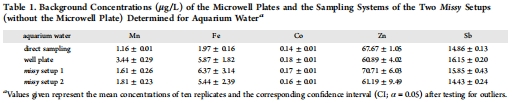 系統背景濃度與回收率數據:測量了兩種missy設置以及微孔板在超純水和實驗用水(水族箱水)中對目標金屬(Mn, Fe, Co, Zn, Sb)的背景值。其研究意義在于驗證了該系統用于常規濃度范圍(μg/L至mg/L)孔隙水分析時,其背景污染可忽略不計,確保了后續剖面數據質量。這些數據主要來自文中的表1和表2。