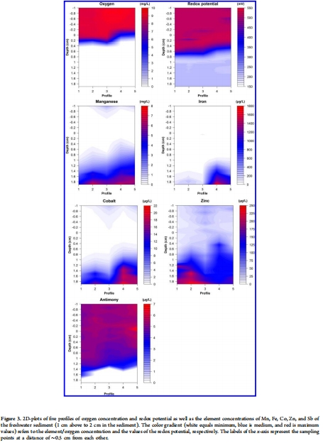 孔隙水金屬/類金屬濃度分布數據:沿沉積物剖面多個位點(一個斷面共5條剖面)測定了溶解態的Mn、Fe、Co、Zn和Sb的濃度。其研究意義在于作為概念驗證,展示了missy系統能夠揭示元素在沉積物-水界面附近的精細分布格局。數據直觀地展示在圖3中,該圖以二維等高線圖形式呈現了整個斷面各種參數(包括金屬濃度)的分布。