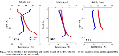 環境背景調查:測量水柱的溫度、鹽度、溶解氧、營養鹽、葉綠素a等參數(表1,圖2)。