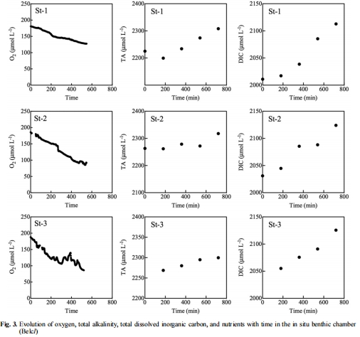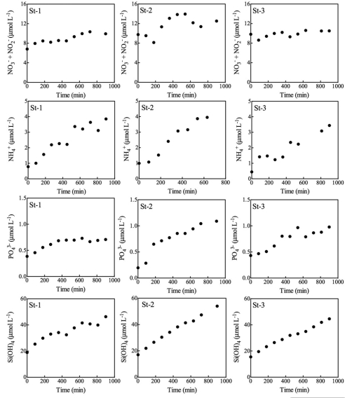 原位培養與底棲通量數據:通過底棲艙培養獲得的溶解氧、總堿度、溶解無機碳及各種營養鹽隨時間變化的曲線,據此計算出的總耗氧率、碳氧化速率及營養鹽(NO2+NO3, NH4+, PO43-, Si(OH)4)底棲通量。其研究意義在于直接、原位測定了沉積物-水界面的關鍵物質交換速率,是有機碳循環和底棲-水層耦合評估的核心依據。培養曲線展示在圖3,計算出的通量速率匯總于表3和表4。