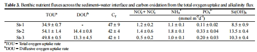 原位培養與通量測量:使用名為BelcI的原位底棲艙培養底層水,測量溶解氧、總堿度、溶解無機碳及營養鹽隨時間的變化,計算總耗氧率及底棲通量(圖3,表3)。同時使用名為BelpI的微剖面儀測量沉積物孔隙水中的氧微剖面,計算擴散耗氧率(圖4)。