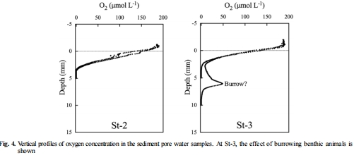 沉積物氧微剖面數據:使用微剖面儀測量的沉積物孔隙水中溶解氧的垂直分布。其研究意義在于揭示了沉積物表層的氧化還原結構,用于計算擴散耗氧率,并發現了St-3站點約6毫米深度處的異常氧峰,這為沉積物中存在生物擾動(如生物鉆孔)提供了直接證據。剖面圖展示在圖4。