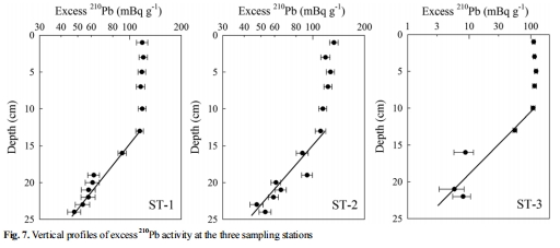 顆粒物通量與沉積速率:使用沉積物捕獲器收集垂直沉降的顆粒物,分析其總質量、有機碳和氮通量(表2)。采集沉積物巖心,分析210Pb和226Ra活度,計算沉積速率(圖7)。