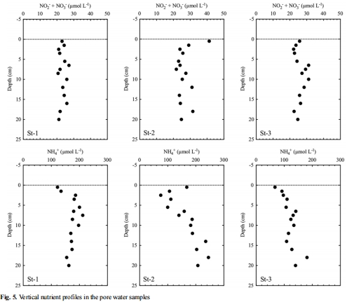 沉積物孔隙水化學數據:從沉積物巖心中提取的孔隙水中營養鹽(硝酸鹽、銨、磷酸鹽、硅酸鹽)的深度剖面。其研究意義在于反映了沉積物中有機物礦化(再生)過程的產物分布,但文中指出表層梯度可能受取樣干擾。這些剖面展示在圖5。