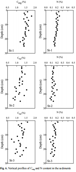 沉積物特性分析:分析沉積物巖心的孔隙水營養鹽剖面(圖5)、固體相有機碳和氮含量及分布(圖6)。
