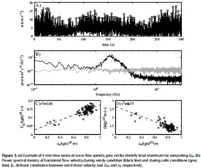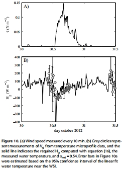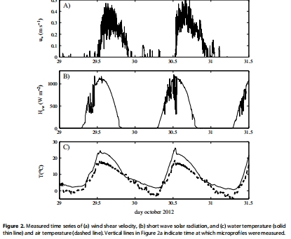 環境背景數據:包括風速/剪切速度、入射短波太陽輻射、水溫和氣溫的時間序列。其研究意義在于刻畫了實驗期間的氣象與熱力背景,顯示了晝夜循環(白天平靜、午后起風)以及水溫的顯著日變化,為理解通量的時間變化提供了環境驅動因子。這些數據展示在文中的圖2。