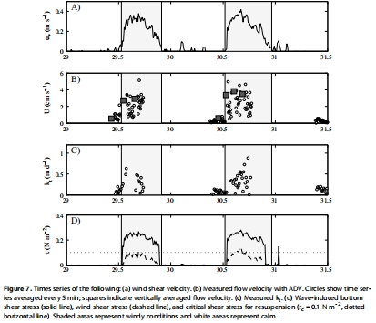 水動力學數據:包括通過聲學多普勒流速儀測量的水平流速時間序列、從中分析得到的波浪特征(波頻率ω、最大軌道速度Um),以及計算得到的擴散傳質系數、波致和風致底部剪切應力。其研究意義在于定量表征了水動力條件,揭示了有風條件下流速和湍流交換(kt)增強約6倍,并確認了波致剪切應力是導致沉積物再懸浮的主要原因。流速譜分析示例見圖3a, b,無量綱化關系見圖3c, d,時間序列結果匯總于圖7a, b, c, d。