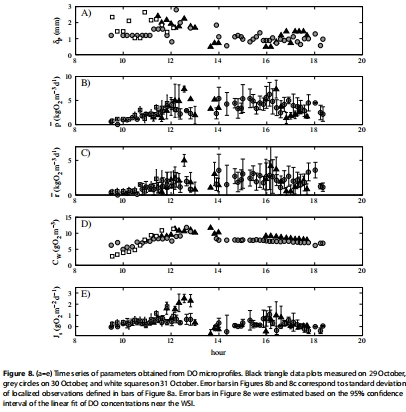 溶解氧相關參數數據:通過對溶解氧微剖面的處理,計算得到:底棲初級生產活性層厚度、沉積物體積溶解氧生產速率、沉積物體積溶解氧消耗速率、擴散邊界層外的水體溶解氧濃度、以及沉積物-水界面溶解氧通量。其研究意義在于直接揭示了底棲初級生產的時空變化(活性層厚度、生產/消耗速率),并量化了溶解氧在界面交換的凈結果。這些參數的時間序列展示在圖8a, b, c, d, e。