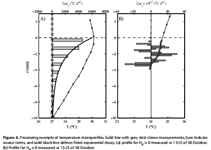 光衰減參數:通過擬合沉積物溫度微剖面中的源項指數衰減,估算得到沉積物中的光衰減系數以及到達沉積物表面的太陽輻射比例。其研究意義在于量化了太陽輻射在沉積物表層(約2.8毫米內)被強烈吸收的特性,這是驅動沉積物加熱和底層水對流的關鍵。該分析基于圖6a等微剖面。