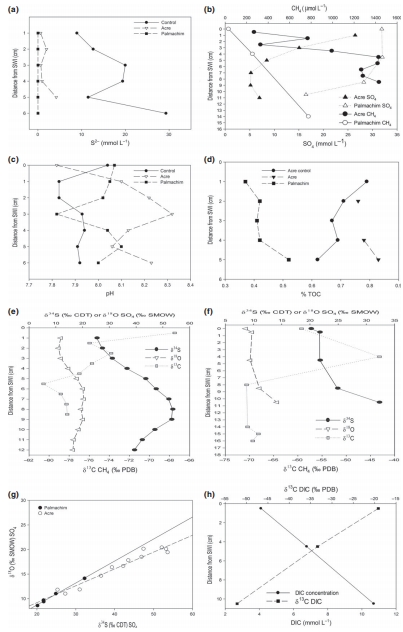 提供了硫酸鹽還原過程強度的直接定量指標(biāo):BSR的終產(chǎn)物之一就是硫化物(H2S, HS-等)。Unisense微傳感器測量的孔隙水總硫化物濃度,是原位、定量反映硫酸鹽還原過程強度的最直接指標(biāo)之一。數(shù)據(jù)顯示,在Ace點,硫化物濃度在沉積物-水界面附近就高達(dá)~9 mmol L?1,在8厘米深處達(dá)到峰值~29.3 mmol L?1(圖2a),這比對照點高出了三個數(shù)量級。這些極高的硫化物濃度數(shù)據(jù),與硫酸鹽的快速消耗、硫酸鹽同位素的顯著分餾(圖2e)以及SRB的高豐度(圖4)相互印證,共同構(gòu)成了證明該點存在極其活躍的硫酸鹽還原作用的完整證據(jù)鏈。沒有可靠的硫化物定量數(shù)據(jù),對BSR速率的評估將缺少一個關(guān)鍵的約束。