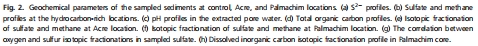 孔隙水地球化學(xué)深度剖面數(shù)據(jù):包括硫酸鹽、甲烷、總硫化物、pH、溶解無機碳的濃度隨沉積物深度(0-10厘米或更深)的變化。其研究意義在于揭示了兩個滲漏點的基本化學(xué)梯度,如硫酸鹽消耗、甲烷積累、硫化物生成等,為微生物活動提供了地球化學(xué)背景。例如,數(shù)據(jù)顯示Acre點硫化物濃度極高,硫酸鹽消耗更快。這些剖面展示在文中的圖2a, b, c。