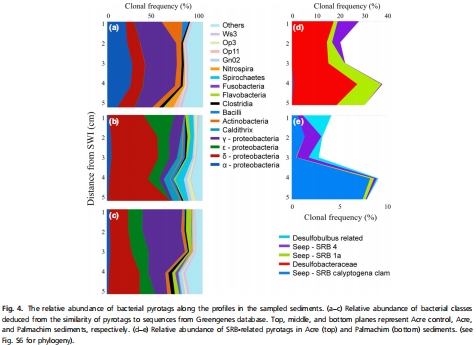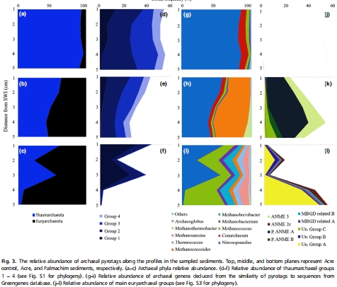 微生物群落組成數(shù)據(jù):通過測序得到的古菌和細(xì)菌各類群的相對豐度,按沉積物深度分層展示。其研究意義在于直接揭示了執(zhí)行碳硫循環(huán)的關(guān)鍵微生物參與者及其垂向分布。例如,在Ace點,ANME-3和潛在ANME A類群占主導(dǎo);在Palmachim點,ANME-2c和未鑒定的古菌類群A占主導(dǎo)。硫酸鹽還原菌的組成也不同。古菌群落數(shù)據(jù)見圖3,細(xì)菌群落數(shù)據(jù)見圖4。