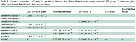 關(guān)鍵類群相關(guān)性數(shù)據(jù):通過Pearson相關(guān)性分析得到的特定古菌類群(如ANME-2c, ANME-3)與特定硫酸鹽還原菌類群相對豐度之間的相關(guān)系數(shù)。其研究意義在于為推測微生物之間的共生關(guān)系(如ANME-SRB共營養(yǎng)體)提供了統(tǒng)計證據(jù)。數(shù)據(jù)顯示ANME-2c豐度與“Calyptogena蛤場SEEP-SRB”豐度顯著正相關(guān)。這些數(shù)據(jù)匯總于文中的表1。