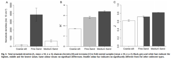 短期缺氧影響不顯著:為期1天和7天的缺氧處理,并未對三種潮下帶沉積物中的線蟲群落的總密度、物種多樣性、群落結構、垂直分布以及優勢種密度產生顯著的負面影響。這否定了研究最初的假設,即沉積物類型和缺氧持續時間會顯著影響線蟲響應。