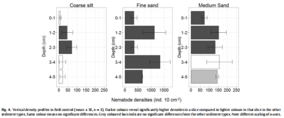 提供了沉積物內部氧微環境變化的直接、高分辨率證據:在實驗結束時,研究者使用Unisense微電極以250微米的高垂直分辨率,測量了所有處理巖心中的沉積物氧滲透深度剖面(補充圖A.2和A..3)。這些剖面數據是連接“上覆水處理”與“沉積物內部生境”的關鍵橋梁。測量結果顯示,在粗粉砂和細沙站,缺氧處理確實導致了沉積物表層氧滲透深度顯著變淺(表4,圖6)。這直接證實了缺氧效應從水柱傳遞到了沉積物中,排除了“缺氧僅停留在水層而未影響沉積物”的可能性,使得“線蟲在缺氧條件下未受影響”的結論更具說服力。