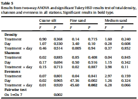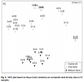 線蟲群落本底數據(野外對照):包括三個站點的線蟲總密度、香農多樣性指數、均勻度指數、垂直密度剖面以及群落組成。其研究意義在于揭示了在自然狀態下,不同沉積類型的線蟲群落存在顯著差異,為評估實驗室處理效應提供了基線。例如,細沙站密度最高,中沙站多樣性最高。密度和多樣性數據展示在圖3,垂直剖面見圖4,群落結構差異的MDS圖見圖5。統計分析結果見表2。