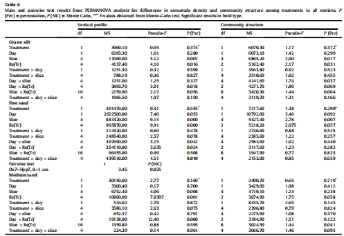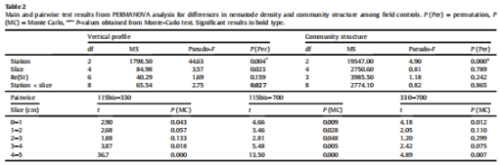 實驗處理效應數據:包括常氧與缺氧處理下線蟲的總密度、多樣性指數、垂直密度剖面、群落結構以及五種優勢種密度的變化。其研究意義在于直接檢驗了短期缺氧對線蟲群落的影響。數據顯示,絕大多數指標在處理間均無顯著差異。總密度和多樣性指數的統計分析結果見表5,垂直剖面和群落結構的PERMANOVA結果見表6,優勢種分析結果見表7。