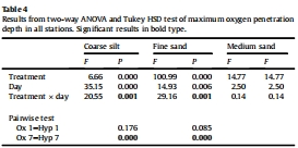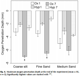 氧滲透深度數據:實驗結束時測量的沉積物中氧的最大滲透深度。其研究意義在于反映了上覆水缺氧處理對沉積物內部氧化還原微環境的實際影響。數據顯示,在粗粉砂和細沙站,7天常氧處理的氧滲透深度顯著深于7天缺氧處理,而在中沙站無差異。統計分析結果匯總于表4,數據以柱狀圖示于圖6。