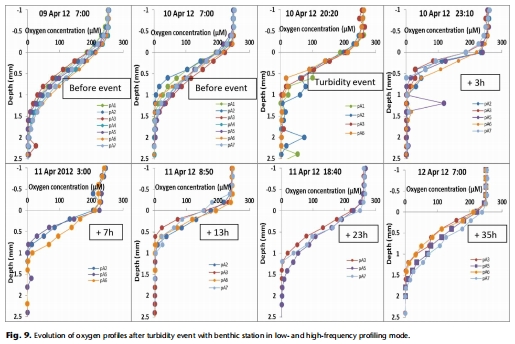 沉積物氧微剖面數(shù)據(jù):通過7個Unisense氧微電極測量的從水體穿過沉積物-水界面進(jìn)入沉積物的溶解氧垂直分布,分辨率為12.5微米。其研究意義在于這是計算擴(kuò)散性耗氧率和氧滲透深度的原始數(shù)據(jù),直接反映了沉積物表層的氧化還原結(jié)構(gòu)和氧氣消耗梯度。這些剖面是理解底棲生物地球化學(xué)過程的核心。文中展示了多個時間點的氧剖面,例如再懸浮事件期間的剖面變化展示在圖9。