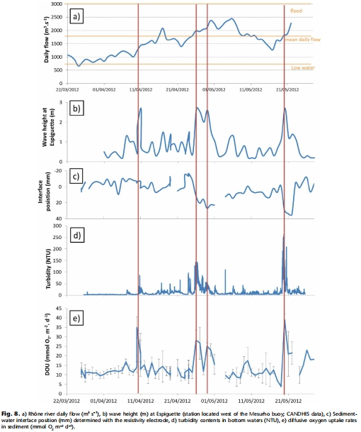 環(huán)境參數(shù)時間序列數(shù)據(jù):通過Aanderaa RCM9傳感器記錄的底部水體濁度、溶解氧、鹽度、溫度,以及從配套浮標(biāo)獲取的波浪高度、羅訥河流量等數(shù)據(jù)。其研究意義在于提供了驅(qū)動沉積物耗氧量變化的外部環(huán)境背景,是解釋DOU時間變化原因和觸發(fā)高頻測量模式的關(guān)鍵。河流流量、濁度、波浪高度和DOU的同步時間序列展示在圖7和圖8。