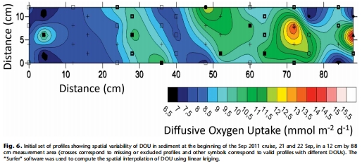 沉積物耗氧量空間異質(zhì)性數(shù)據(jù):在每次部署開始時,沿0.88米長的水平軸在8個不同位置測量的56個氧剖面所計算的DOU值。其研究意義在于評估了測量區(qū)域的初始空間變異性,為后續(xù)時間序列分析中區(qū)分空間與時間效應(yīng)提供了基線。2011年9月部署初始的空間變異性圖譜展示在圖6。