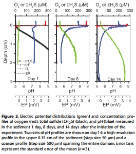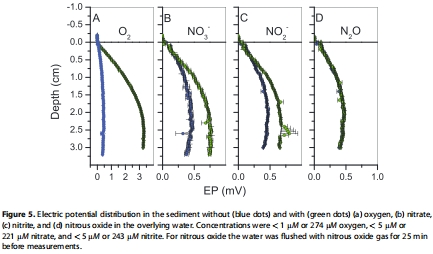 該論文摘要指出,絲狀的多細胞脫硫球藻科細菌通過在海洋沉積物中催化深層缺氧層的硫化物氧化和表層沉積物的氧氣還原,并在這兩個空間分離的位點之間傳輸電子,從而形成了一個“生物地球電池”。研究使用微電極測量了該系統中產生的電場,發現電場與沉積物頂部2厘米內微生物產電活動的生物地球化學指標有良好關聯。移除氧氣后,電場在一分鐘內崩潰,重新引入氧氣后又恢復,證明了有氧微生物活動與電場存在的直接耦合。通過建模電位分布,可以量化和定位電子源(陽極氧化位點)和電子匯(陰極還原位點)。大部分陽極氧化被限制在缺氧區下部檢測不到游離硫化物的區域,表明硫化鐵是主要的硫源。來自缺氧沉積層的電子流最高可為沉積物有氧活動的80%提供能量。電場對上覆水中硝酸鹽、亞硝酸鹽或一氧化二氮存在與否的快速響應,證明了亞硝酸鹽或一氧化氮(可能還有硝酸鹽)具有作為陰極電子受體的潛力,但一氧化二氮沒有。