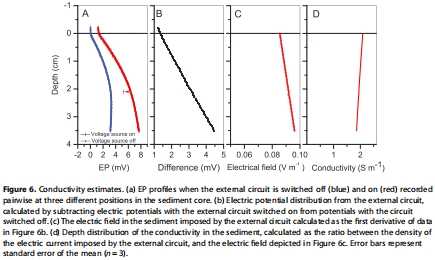 沉積物電導率剖面:通過向沉積物中外加一個已知的小電流密度,并測量由此產生的額外電位梯度來計算。意義:這是將測量的電場(V/m)轉換為電流密度(A/m2)的關鍵參數。數據表明電導率在2.09到1.86 S/m之間,并隨深度因壓實作用而輕微降低。數據來自圖6。