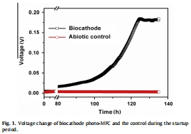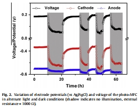 Desmodesmus sp. A8 能作為有效的光生物陰極,在光照下顯著提升微生物燃料電池的產電。