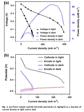 光強對電池性能有深遠影響,且主要通過影響陰極起作用(陰極電位變化大,陽極電位變化小)。