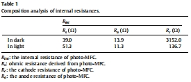 電化學阻抗譜:分析了電池的內阻組成,包括歐姆內阻、陽極電阻和陰極電阻(表1)。意義:定量解析了性能提升的瓶頸。數據表明,開啟光照后,陰極電阻急劇下降(從3152.0 Ω降至136.7 Ω),是性能提升的主因,而陽極電阻變化不大。