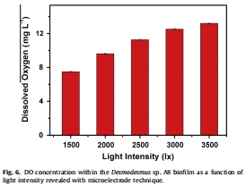 證實產氧位置與機制:數據直接顯示,在光照下,生物膜內部的溶解氧(從4.3 mg L?1升至7.5 mg L?1,圖S2)遠高于無光條件,隨后隨光強增加繼續上升(在3500 lx達13.2 mg L?1,圖6)。這強有力地證明了性能提升的直接原因是附著在陰極上的微藻在生物膜內進行了光合作用并產生氧氣,而非從溶液本體擴散而來。