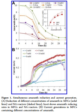 電流生成與偶氮染料還原:測量了MFC的電流輸出(圖1B)和陽極液中偶氮染料濃度的變化(圖1A)。意義:直接證明在所選體系中,產電(陽極還原)和偶氮染料還原可以同時進行,且存在染料的MFC產生了更高的電流,表明存在協同而非簡單競爭。