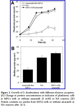 浮游與生物膜細胞生長:通過蛋白質含量評估了浮游細胞(圖2A)和陽極生物膜(圖2B)的生物量。意義:揭示了空間分離的呼吸策略。數據顯示浮游細胞的生長主要由偶氮染料還原驅動,而生物膜的生長則同時受益于陽極呼吸和偶氮還原,表明生物膜細胞能利用兩種電子受體。
