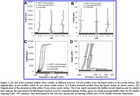生物膜內pH剖面:使用pH微電極測量了從溶液本體到陽極表面的pH梯度(圖3A, B)。意義:直接證實了不同的呼吸模式導致生物膜內不同的質子動態。僅在陽極呼吸時,生物膜內出現pH下降梯度(質子積累);而當同時進行偶氮呼吸時,該梯度減弱或消失,因為偶氮還原的副產物消耗了質子。