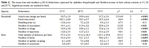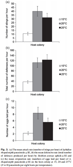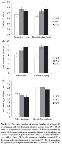 在一對一互動中,測量單次攻擊后的產卵成功率(Fig. 2c)。意義:顯示在簡單互動中,蚜蟲防御行為能降低寄生成功率,但該成功率不隨溫度變化。