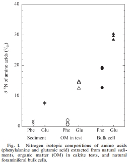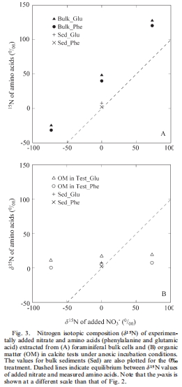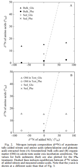 對于自然本底樣品,整體細胞氨基酸的δ15N值比殼內有機質富集約15‰(圖1)。意義:暗示在自然環境中,A. beccarii也可能存在硝酸鹽利用和15N富集過程。