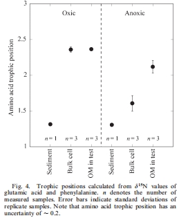 營養級位置估算:基于谷氨酸和苯丙氨酸的δ15N值計算了營養級(圖4)。意義:在缺氧條件下,整體細胞的估算營養級(~1.6)顯著低于有氧條件(~2.3)及其他樣品。這支持了整體細胞中有自養微生物貢獻氨基酸的推論,因為自養生物的加入會降低整體樣品的表現營養級。