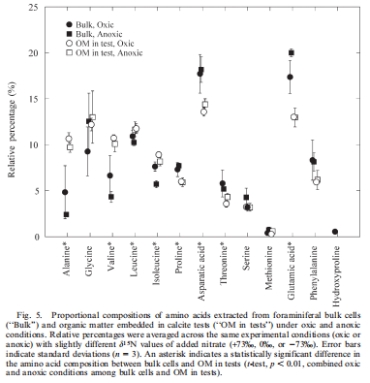 氨基酸相對豐度:比較了整體細胞與殼內有機質中各種氨基酸的比例(圖5)。意義:兩者氨基酸組成存在顯著差異,且在缺氧條件下差異更明顯。這進一步支持整體細胞和殼內有機質的氨基酸來源不同,即整體細胞中包含微生物特有的氨基酸組成。