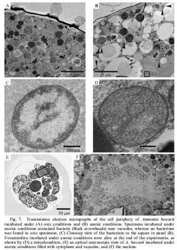 細胞超微結構:透射電鏡觀察顯示,在缺氧條件培養的有孔蟲細胞質中發現了桿狀細菌(內共生體),而在有氧條件培養的細胞中則未發現(圖7)。意義:為“微生物貢獻”假說提供了直接的形態學證據,將同位素數據與具體的生物學結構聯系起來。