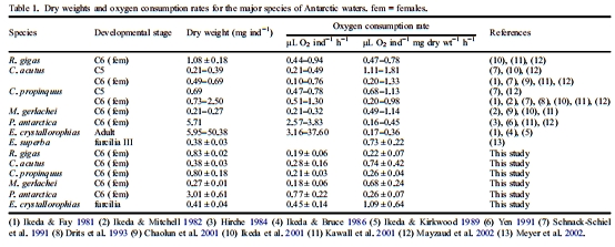 代謝率存在物種間差異:體型較大的物種(如R. gigas, C. propinquus, P. antarctica)呼吸速率較低;體型較小的物種(如M. gerlachei, C. acutus)以及磷蝦幼體呼吸速率較高。磷蝦幼體的重量特異性呼吸速率是所有被測物種中最高的。