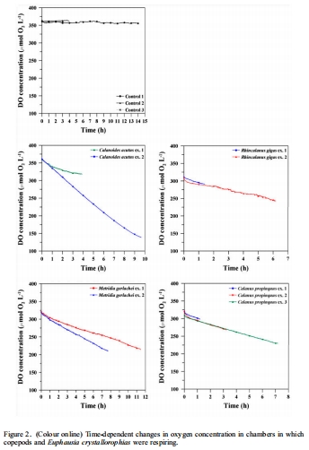 絕對與重量特異性呼吸速率:計算并報告了每個物種的個體氧氣消耗速率(μL O? ind?1 h?1)和重量特異性呼吸速率(μL O? mg dry wt?1 h?1)(表1)。意義:這是研究的核心量化結果。這些數據直接提供了阿蒙森海關鍵浮游動物類群的代謝率基準值,揭示了物種間的差異(如大體型物種速率較低,小體型磷蝦幼體速率最高),并與歷史數據進行了對比,為建立該區域能量流動和生物地球化學循環模型提供了關鍵參數。