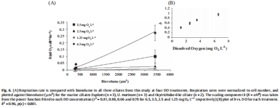 代謝標度指數:計算了代謝率與生物體積之間冪律關系的標度指數,并分析了該指數隨溶解氧的變化。意義:檢驗了普遍存在的“3/4冪律”在低氧脅迫下的適用性。研究發現標度指數隨溶解氧降低而線性下降,表明在低氧環境中,單位體積的代謝需求不再與體積保持恒定比例關系,這對基于尺寸的生態系統模型有重要啟示。數據來自圖6。