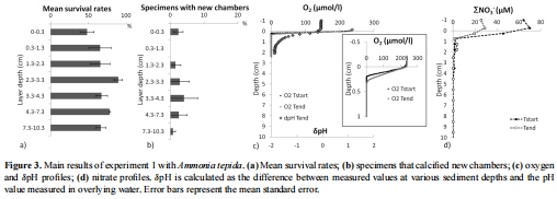 孔隙水硝酸鹽濃度:分析了不同深度沉積物孔隙水中的硝酸鹽(及亞硝酸鹽)含量。意義:用于判斷有孔蟲可能進行反硝化代謝的電子受體是否存在。數據顯示硝酸鹽在某些層中存在,但在更深層中耗盡(圖3d, 圖5d)。