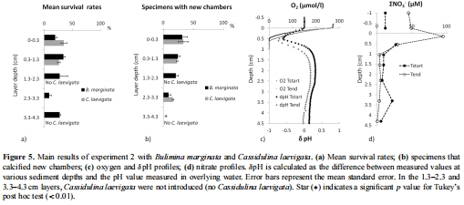 有孔蟲存活率:計算了每個沉積層中有孔蟲在60天培養后的存活百分比。意義:直接量化了三種有孔蟲對缺氧條件的耐受性。數據顯示,Ammonia tepida和 Bulimina marginata在各層(包括深層缺氧區)的存活率無顯著差異,而 Cassidulina laevigata在缺氧層全部死亡(圖3a, 圖5a)。