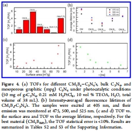 光催化產氫性能:測量了不同材料在鉑助催化下的產氫速率。意義:量化了光催化活性。最佳材料CM1B0.05的活性比介孔C?N?高60%以上。證明了結構改性的有效性。數據來自支持信息圖S4、S6及正文相關描述。